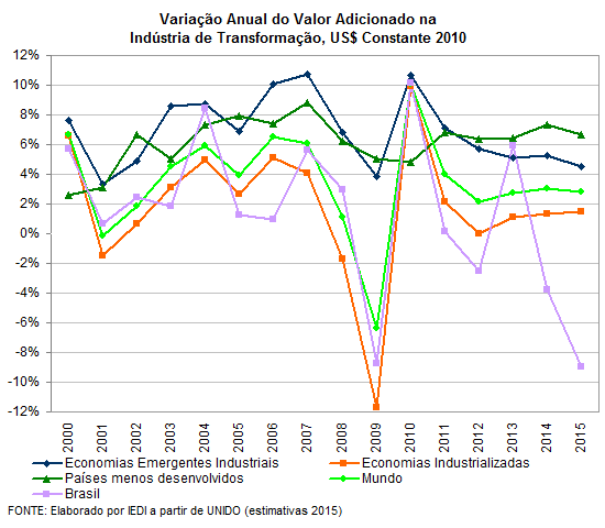 Observando-se a trajetória da variação anual do valor adicionado na indústria de transformação desde 2000, em dólares constantes de 2010, depreende-se que o Brasil acompanhou a tendência mundial na maior parte dos anos, exceto em 2003, 2006, 2007 e 2014. Porém, em 2014 e 2015, as retrações anuais de -3,8% e -9,0% das manufaturas brasileiras são vertiginosas comparativamente à média mundial (3,0% e 2,8%, respectivamente) e das economias emergentes industriais (5,3% e 4,5%). O grupo dos países emergentes, aliás, assinalaram taxas de variação mais expressivas, menos voláteis e mais resistentes às crises. Em 2015 o único grupo que conseguiu acelerar o crescimento do valor adicionado da indústria de transformação foi o das economias industrializadas, passando de 1,4% em 2014 para 1,5%.