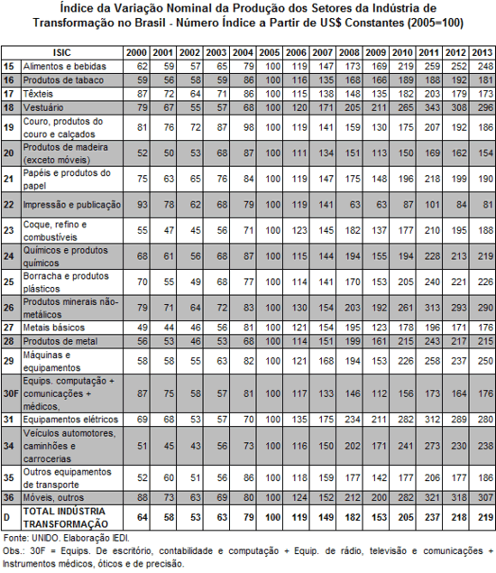 Essa conclusão também é visível analisando a evolução da produção dos setores, disponível em valores correntes. A produção da indústria de transformação mais do que dobrou de 2005 para 2013, em dólares correntes. Tomando-se 2005 como ano-base tiveram crescimento mais significativo: móveis, vestuário, produtos minerais não metálicos, equipamentos elétricos e alimentos/bebidas. Por outro lado, produtos de madeira, têxteis, produtos de tabaco, produtos do couro/ calçados, papéis e produtos, e sobretudo impressão e publicação (que apontou variação negativa no período) tiveram uma evolução abaixo da média da indústria, sobretudo por conta da concorrência com importados.