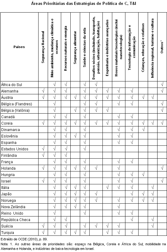 Nos planos nacionais e nas estratégias de C,T&I, os governos identificam áreas-chave para priorização e concentração dos suportes à pesquisa e à inovação. Como nos anos anteriores, permanecem como dominantes as áreas de tecnologia de informação, nanotecnologia, saúde e energia. Porém, as áreas sociais têm recebido igualmente crescente atenção. Essas áreas incluem: mudança climática, energia, envelhecimento, gestão de recursos hídricos, segurança pública. Nos países em desenvolvimento, educação superior e redução da pobreza também estão entre áreas priorizadas.