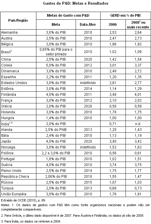De acordo com o relatório, um dos fatores para o aumento das despesas de P&D tem sido a fixação de metas de gastos de P&D na maioria dos países da OCDE. Inúmeros países europeus, por exemplo, tinham estabelecidos metas de P&D de 3% do PIB até 2010, em sintonia com a Agenda de Lisboa. Embora a maioria ainda esteja aquém deste objetivo, alguns países (como Áustria e Portugal) efetuaram progressos significativos em reduzir o diferencial em relação à meta comunitária. Áustria, por exemplo, esperava chegar a seu destino de 2,8% do PIB até 2010. Outros países com significativa capacidade tecnológica e de P&D, buscam metas superiores a 3% do PIB, como são os casos da Finlândia e da Suécia: 4% do PIB até 2010.