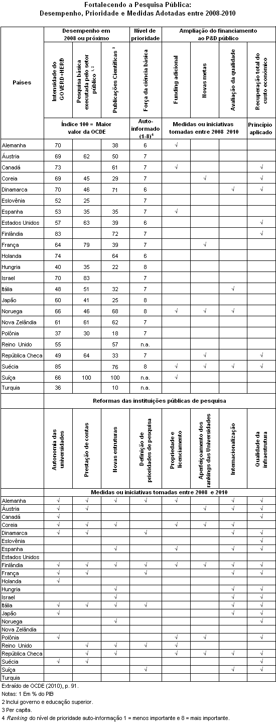 Em contraste, nos países da OCDE que registram relativo atraso no desempenho da inovação, os planos e/ou estratégias nacionais de C,T&I priorizam o desenvolvimento da capacidade institucional para dirigir ou gerenciar as políticas governamentais, para reforçar os laços entre a pesquisa pública e indústria e melhorar a qualidade do ensino superior e pesquisa.