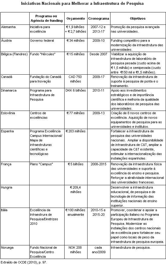 Igualmente, a manutenção de alta qualidade da infraestrutura de pesquisa é fundamental para a melhoria da qualidade da pesquisa pública e para a oferta de melhores condições de pesquisa para atrair pesquisadores nacionais e estrangeiros altamente qualificados de classe mundial. Por essa razão, vários governos têm aumentado a alocação de recursos para modernização das infraestruturas das universidades e institutos públicos de pesquisa ou para construção de novas infraestruturas de pesquisa com vistas a ampliar suas capacidades.