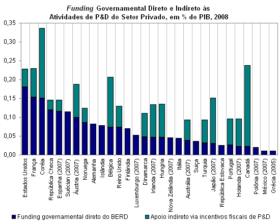 O número de países da OCDE que oferece algum tipo de incentivo fiscal para as atividades de pesquisa e inovação continua crescendo, passando de 12 em 1995 e 18 em 2004 para 22 em 2009. Embora haja países que não oferecem quaisquer incentivos fiscais para as atividades de P&D ou inovação, na grande maioria dos países da OCDE que oferecem esse tipo de incentivo, os subsídios fiscais ao P&D tornaram-se mais generosos. Os países que mais aumentaram o suporte indireto ao P&D foram França, Noruega e Holanda (para pequenas e médias empresas).