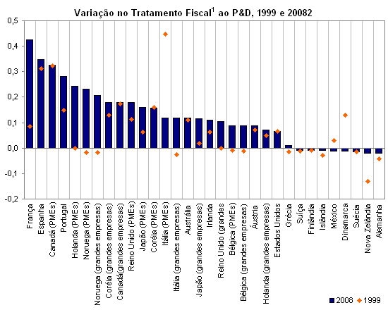 De acordo com o estudo, em 2008, último dado disponível, a França e Espanha forneceram os regimes mais generosos, com incentivos fiscais, respectivamente, de 0,425 e 0,349 unidade de despesa de P&D por dólar. Contrariamente à tendência geral, México e Nova Zelândia revogaram o seu crédito fiscal concedido às atividades de P&D em 2008. No caso do México, o benefício fiscal foi convertido em apoio financeiro direto em 2009. Já a Nova Zelândia, que havia introduzido um benefício fiscal de 15% para o P&D, revogou essa medida a partir do ano fiscal de 2009-10 e introduziu novos esquemas.