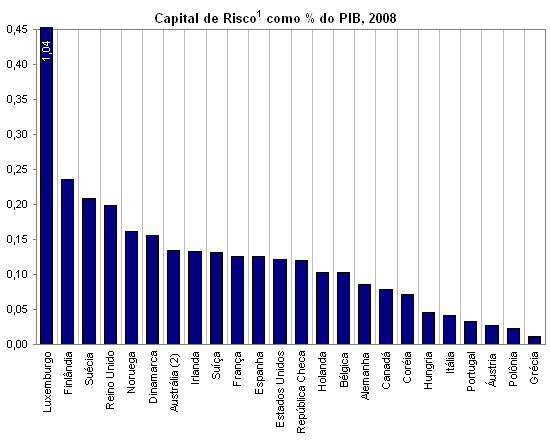 A importância do capital de risco como fonte de financiamento da inovação e do empreendedorismo varia consideravelmente entre os países da OCDE. Em 2008, Luxemburgo ocupava a liderança, com investimentos de capital de risco da ordem de 1,04% do PIB. Investimentos de capital de risco foram também expressivos na Finlândia, Suécia e Reino Unido (próximo ou ligeiramente acima de 0,20% do PIB). No extremo oposto, Japão e Grécia apresentaram capital de risco próximo ou inferior a 0,01% do PIB.