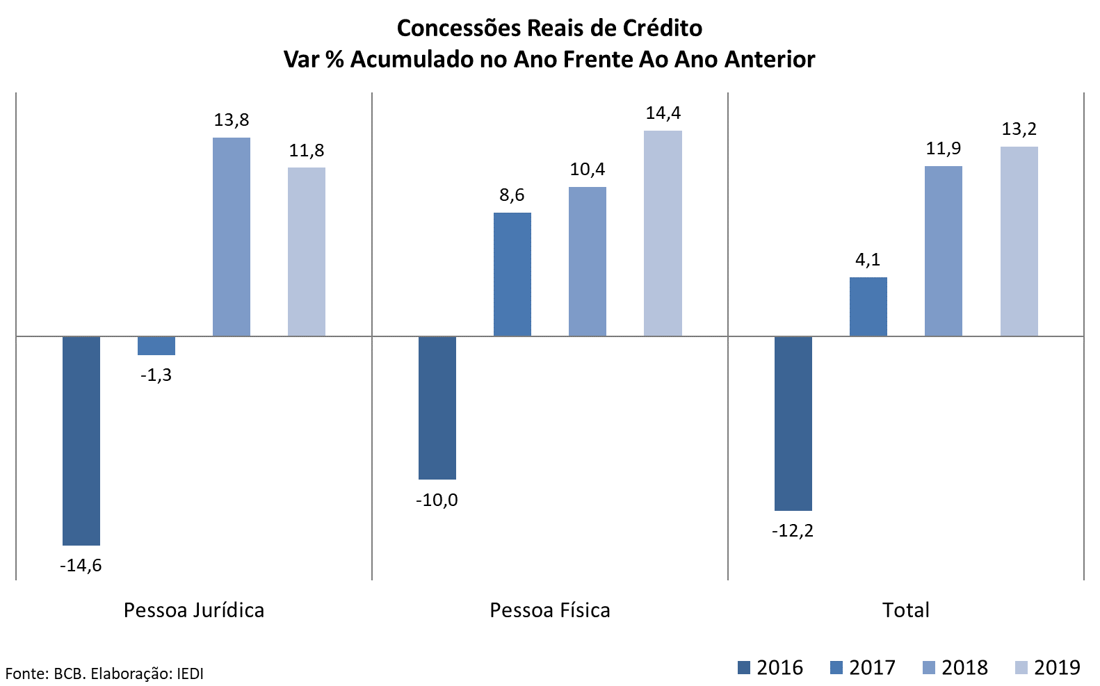 • Concessões reais de crédito total: +4,1% em 2017; +11,9% em 2018 e +13,2% em 2019;