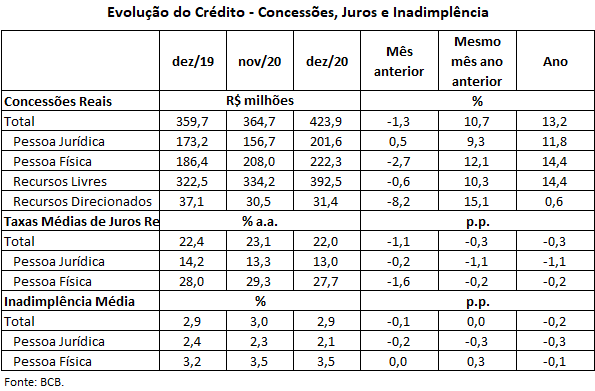Para o mês de dezembro de 2019, foram concedidos R$ 428,8 bilhões em novas operações de crédito, variação positiva de 19,0% frente ao montante de R$ 360,2 bilhões observado em dezembro de 2018. Deste volume, R$ 397,0 bilhões foram originados de recursos livres e R$ 31,8 bilhões de recursos direcionados, o que resultou, frente a dezembro de 2018, em expansão de 22,9% para recursos livres e em retração de 14,5% para recursos direcionados.