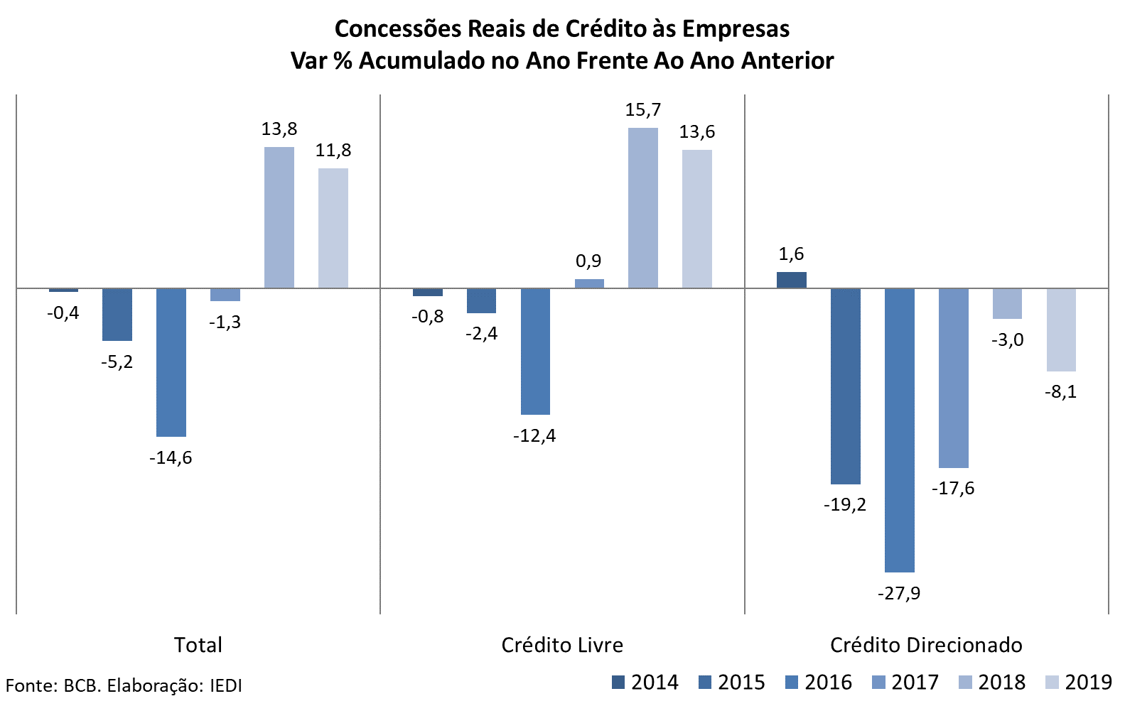 A contração do financiamento oficial, que em 2019, completou cinco anos, é um dos fatores que dificultam a recomposição mais consistente do financiamento corporativo no país. O encolhimento das atividades do BNDES, notadamente de sua carteira de financiamento ao investimento, é a principal razão desta evolução. No ano passado, as concessões reais do crédito direcionado às empresas caiu -8,1%, já o BNDES registrou -25,6% ante 2018.