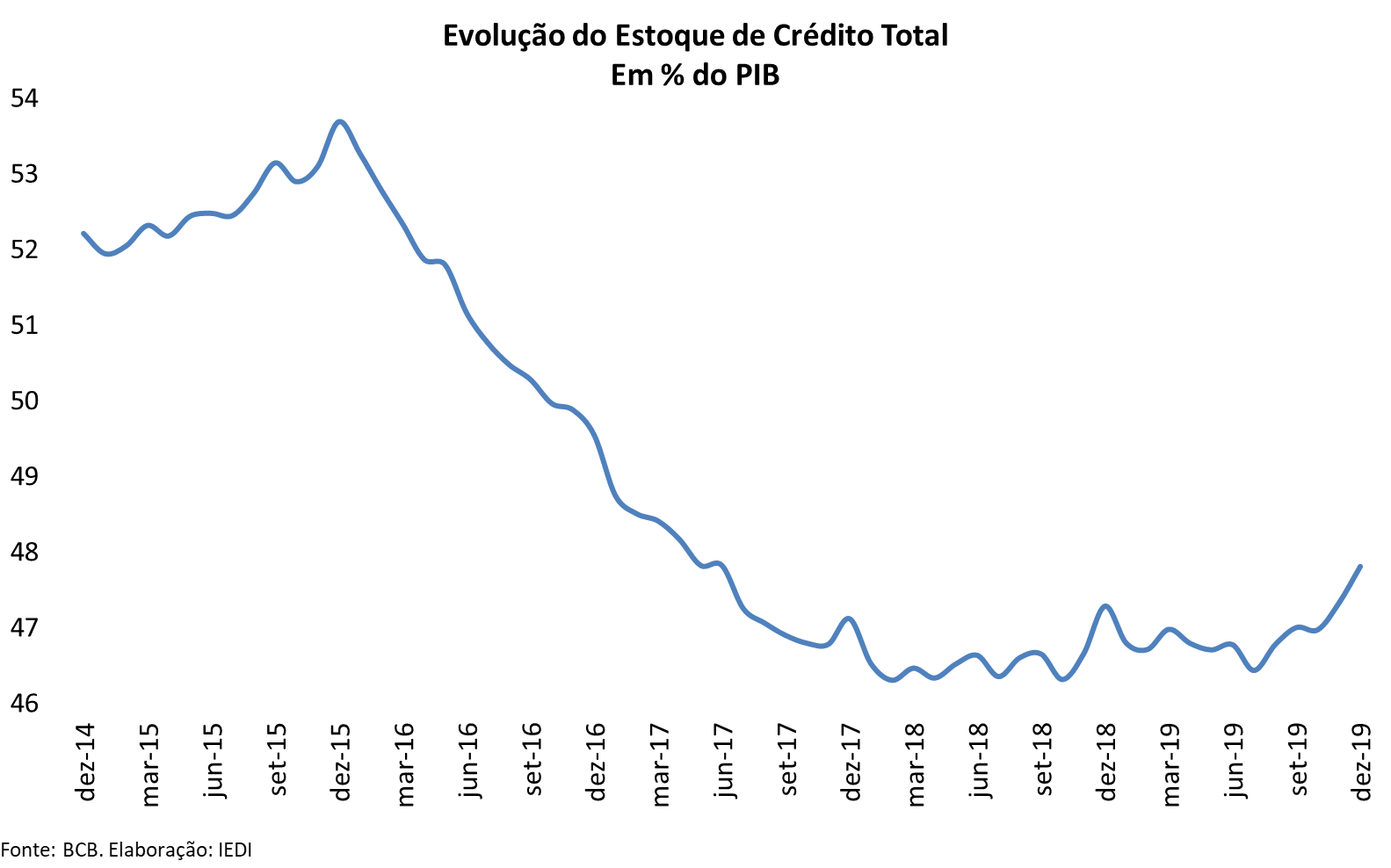 Em 2019, as operações de crédito continuaram se expandindo, ajudando a injetar dinamismo na economia. As concessões totais de novos empréstimos cresceram +13,2% em termos reais, isto é, já descontada a inflação medida pelo IPCA. Com isso, embora permaneça aquém do patamar anterior à crise 2015-2016, o estoque total de crédito atingiu 47,8% do PIB, referente a R$ 3,5 bilhões.