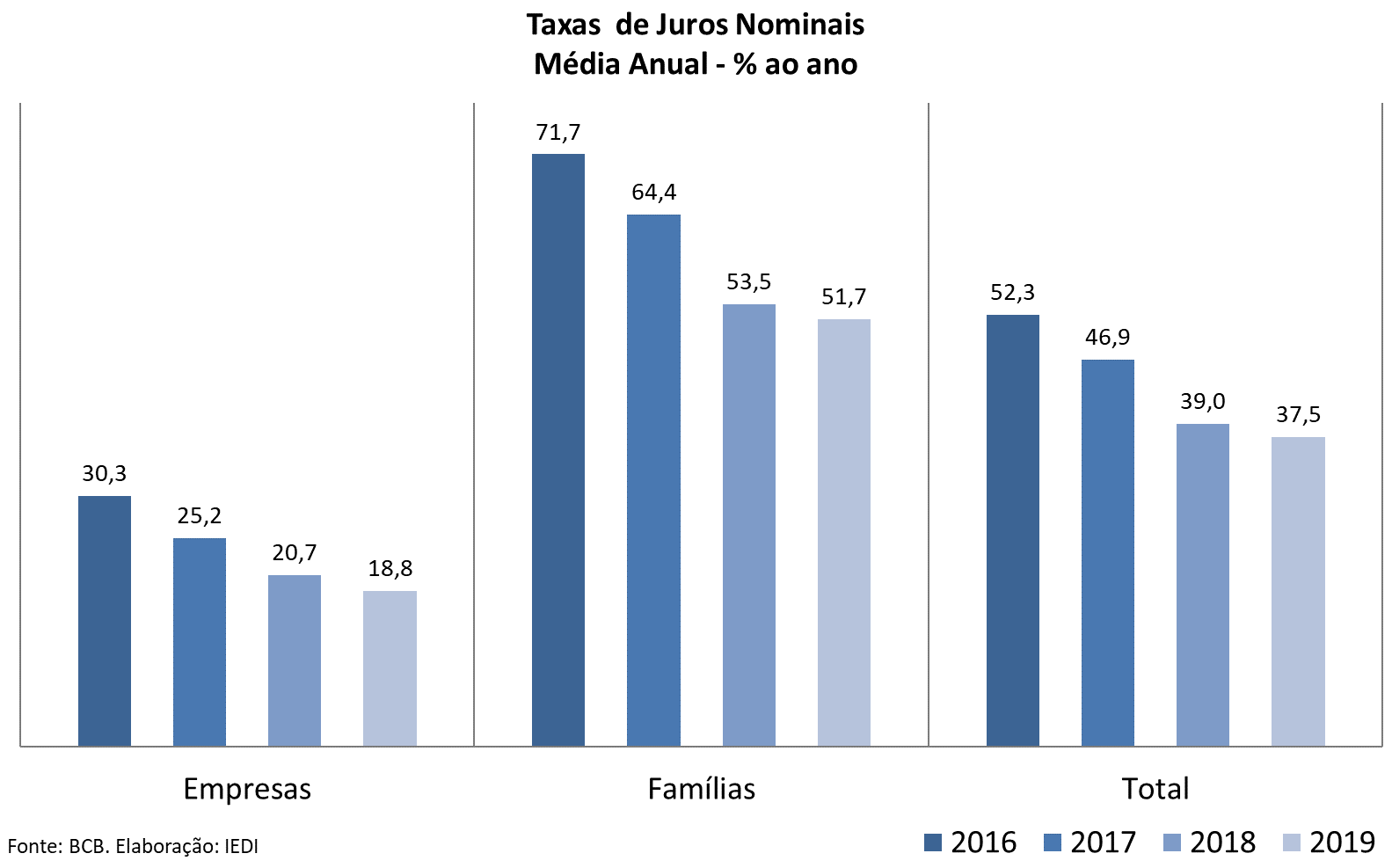 No caso das famílias, as taxas médias de juros em 2019 recuaram tão somente 3%, mantendo os patamares expressivos que têm sido a regra no Brasil. Passaram, no crédito livre, de 53,5% ao ano em 2018 para 51,7% ao ano em 2019. Isso significa que a redução da taxa Selic no ano passado não foi repassada aos juros finais, limitando o número de potenciais tomadores de novos empréstimos. Os spreads e a inadimplência dessas operações mantiveram-se nos mesmos níveis médios de 2018.