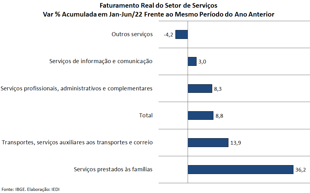 • Serviços total: +9,5% no 1º trim/22; +8,2% no 2º trim/22 e +8,8% em jan-jun/22;
