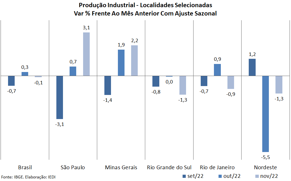Em novembro de 2022, quando a produção industrial nacional registrou variação negativa de -0,1% frente ao mês imediatamente anterior na série livre de influências sazonais, nove dos quinze locais pesquisados apresentaram taxas positivas, sendo os maiores: Paraná (8,5%), Espírito Santo (7,6%), Ceará (4,3%) e Mato Grosso (3,8%). Em sentido oposto, Pará (-5,2%), Pernambuco (-2,0%), Rio Grande do Sul (-1,3%) e Nordeste (-1,3%) apontaram os recuos mais elevados no período.