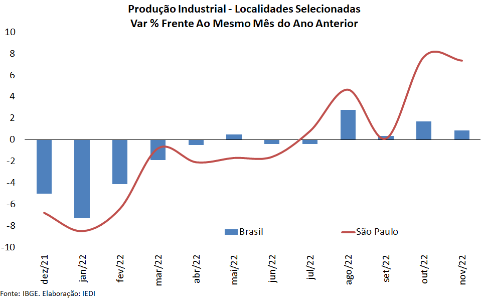 Analisando em relação a novembro de 2021, registrou-se aumento de 0,9% da indústria nacional. Entre os quinze locais pesquisados, cinco registraram expansão da produção, sendo as maiores observadas em: São Paulo (7,3%), Rio de Janeiro (6,0%), Minas Gerais (4,7%) e Goiás (4,2%). Os dez locais pesquisados restantes que registraram as maiores retrações da produção nessa base de comparação foram: Pará (-16,5%), Espírito Santo (-12,2%), Paraná (-9,8%) e Ceará (-8,9%).