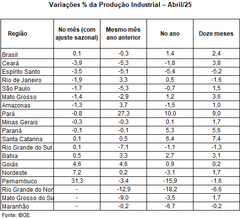 Hoje, o IBGE divulgou o perfil regional deste desempenho agregado pouco animador. Uma parcela majoritária de 60% dos parques industriais não conseguiu ampliar produção na passagem de mar/25 para abr/25 na série com ajuste sazonal.