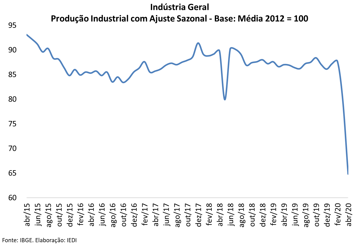 A produção industrial sofreu um colapso na passagem de março abril de 2020, recuando -18,8% já descontados os efeitos sazonais. Contribuíram para tanto as medidas de isolamento social, mas também a queda acentuada das exportações de manufaturados, rupturas de cadeias de fornecedores e o quadro de elevado medo e incerteza, bloqueando decisões de investimento e de consumo de muitos bens industriais.