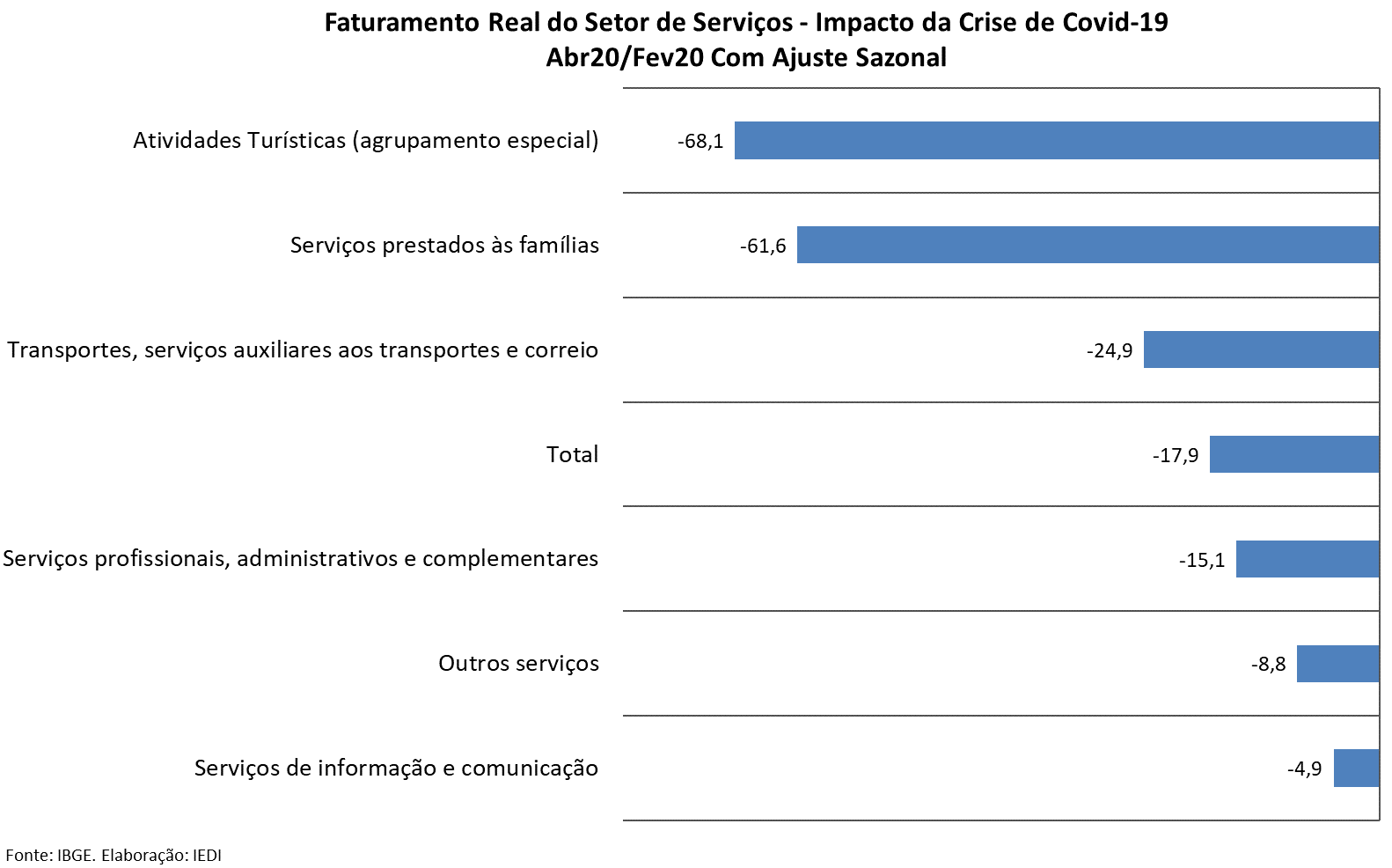 Trata-se do efeito direto das medidas de isolamento social e dos protocolos de distanciamento físico, que tendem a afetar atividades mais intensivas em mão de obra. Este declínio dos serviços prestados às famílias também é resultado da elevação do desemprego e da perda de renda de muitos daqueles que preservaram suas ocupações. Seu componente mais afetado foi o de serviços de alojamento e alimentação (-64,6% para abr20/fev20).