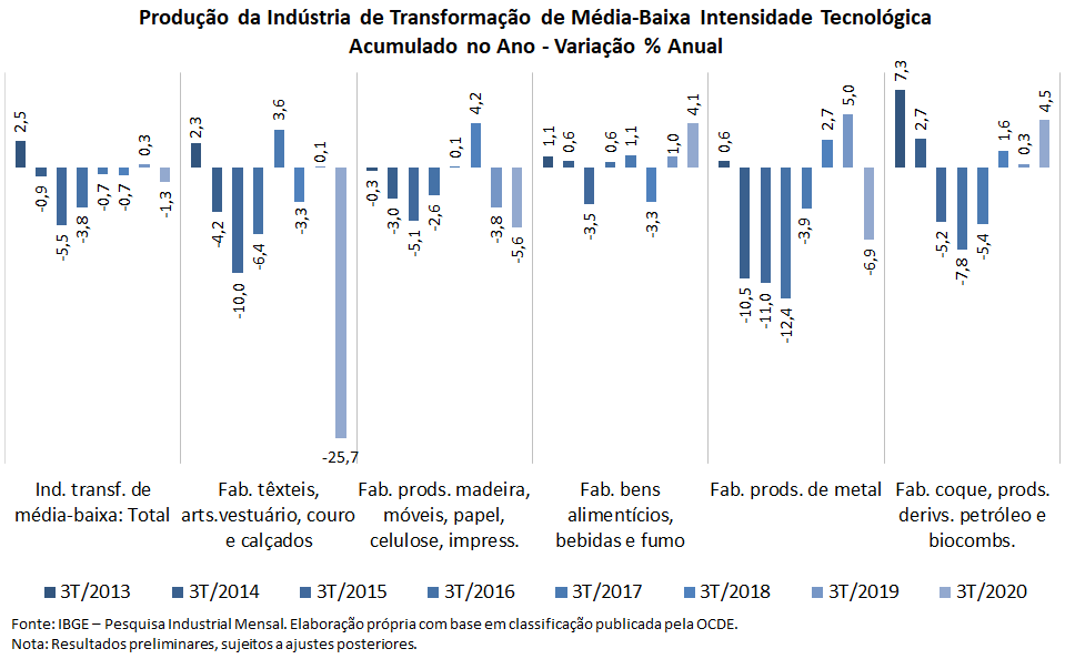 Dos ramos da indústria de transformação de média-baixa tecnologia, a fabricação de produtos de metal (exceto armas, munições e equipamentos bélicos) teve comportamento ao desse conjunto, enquanto a indústria de alimentos, bebida e fumo e produção de derivados e petróleo, biocombustíveis e afins cresceram nessas quatro bases de comparação. Noutro extremo, a produção de têxteis, artigos de vestuário, de couro e calçados sofreu retração nessas mesmas bases comparativas.