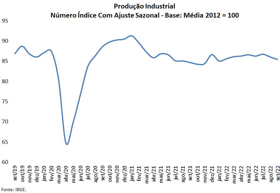 Em setembro de 2022, a produção industrial assinalou variação de -0,7% frente ao mês anterior, já descontados os efeitos sazonais, repetindo o mesmo desempenho registrado em ago/22. Com isso, a sequência de resultados marcada por oscilações foi interrompida, dando lugar a perdas consecutivas.