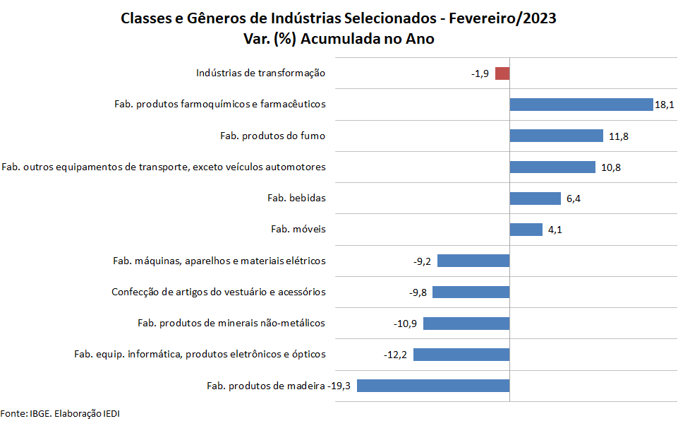 Já na comparação com fev/22, o setor industrial assinalou retrocesso de -2,4% em fev/23, com resultados negativos em 17 dos 25 ramos, 57 dos 80 grupos e 56,8% dos 789 produtos pesquisados. Convém lembrar que fev/23 teve 18 dias úteis, um dia útil a menos do que fev/22 (19 dias).