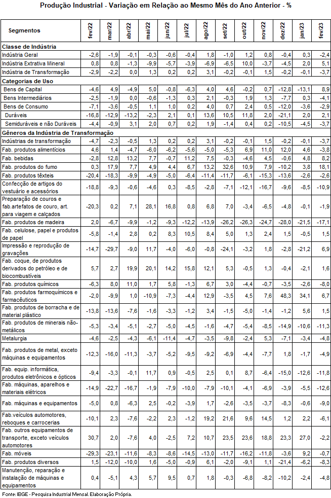 Na comparação com fev/22, enquanto a indústria geral recuou -2,4%, o desempenho da indústria de transformação foi ainda mais adverso: -3,7%, sua terceira variação negativa consecutiva. A indústria extrativa reforçou seu desempenho de jan/23 (+2,0%) e cresceu +5,1% em fev/23.