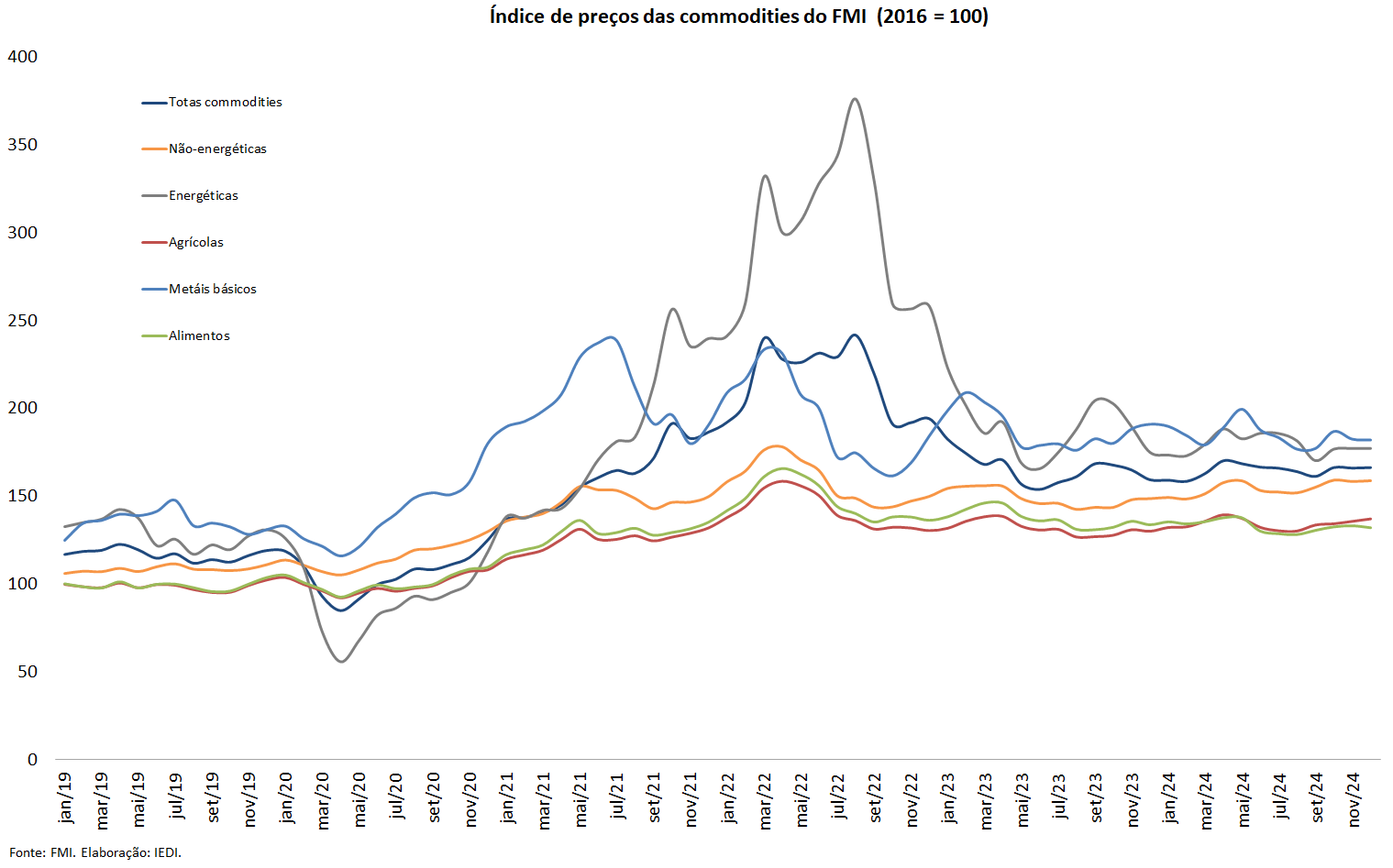 Do lado externo, a relativa estabilidade do dinamismo do PIB mundial estimado pelo FMI no seu cenário para o desempenho da economia global de outubro passado (Carta IEDI n. 1288) foi confirmada na atualização do cenário do FMI no World Economic Outlook Update de janeiro de 2025. Segundo o Fundo, o PIB mundial cresceu 3,2% em 2024 mantendo o ritmo de 2023, devendo se repetir em 2025-2026 (3,3%). Já os preços de todas categorias de commodities manteve-se estável. São evoluções que moderam nosso impulso exportador.
