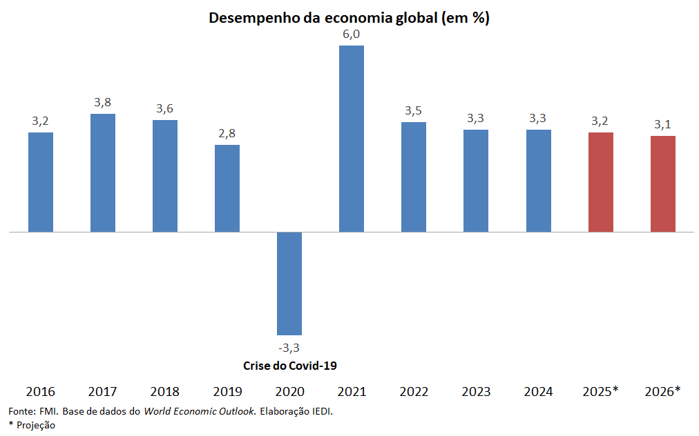Caminhamos, assim, de volta ao desempenho projetado logo na entrada do ano (+3,3% em jan/25), mas ainda assim a economia mundial seguirá abaixo do ritmo médio pré-pandemia (+3,7% em 2001-2019). Esta desaceleração terá sequência em 2026, segundo o Fundo.