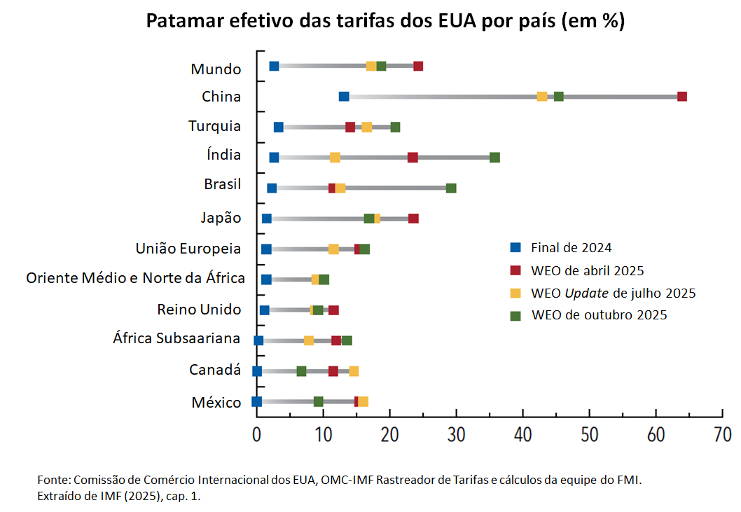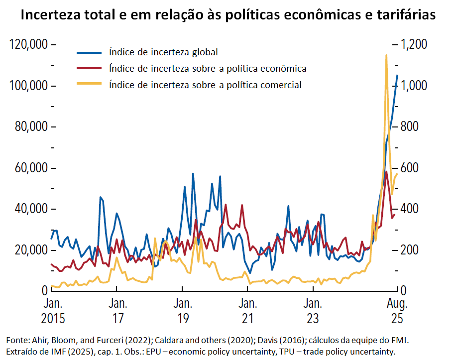 De acordo com o FMI, o ano de 2025 tem sido volátil como reflexo da reordenação das prioridades de política nos Estados Unidos e da adaptação dos demais países à nova realidade. A reordenação não envolve apenas a política tarifária, mas também cortes na ajuda internacional ao desenvolvimento, medidas mais restritivas contra a imigração e políticas fiscais mais acomodatícias, devido, em grande parte, ao aumento dos gastos em defesa.