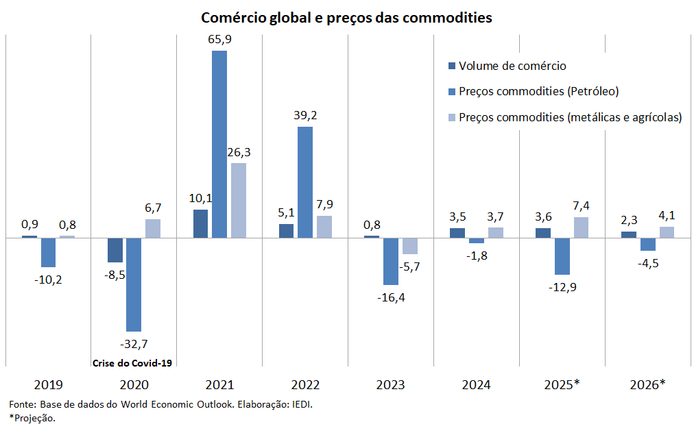 A projeção do PIB global para 2026, não foi alterada em relação ao cenário anterior, devendo ficar em +3,1%, menor portanto do que o resultado de +3,2% de 2025 e +3,3% de 2024. Muito disso, virá de efeitos secundários sobre o comércio global de bens e serviços, que em 2026, deve crescer apenas +2,3% ante +3,6% em 2025 e +3,5% em 2024.