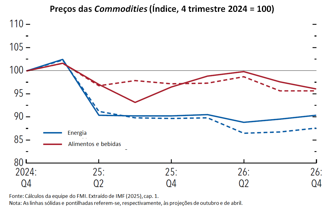 • Preços das commodities: o Fundo projeta uma queda de 7,9% nos preços das commodities energéticas em 2025 e de 3,7% em 2026, resultado da redução do preço do petróleo a um ritmo inferior ao previsto no cenário de abril. Os preços das commodities não-energéticas devem crescer 7,4% em 2025 e 4,1% em 2026, percentuais menores do que em abril porque os aumentos dos preços dos alimentos e bebidas foram revistos para baixo.