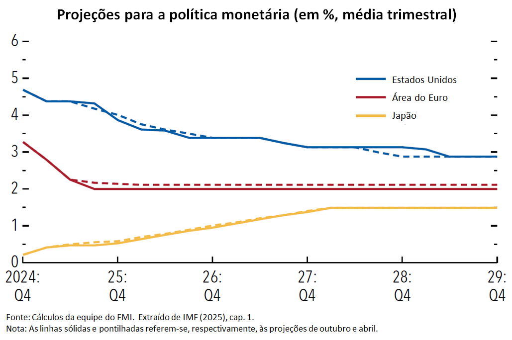 Nos EUA, o FMI projeta uma redução um pouco mais antecipada do que o previsto no cenário de abril, com a taxa dos fundos federais recuando para a faixa de 3,50-3,75% no final de 2025 e atingindo seu intervalo terminal de 2,75-3,0% no final de 2028.