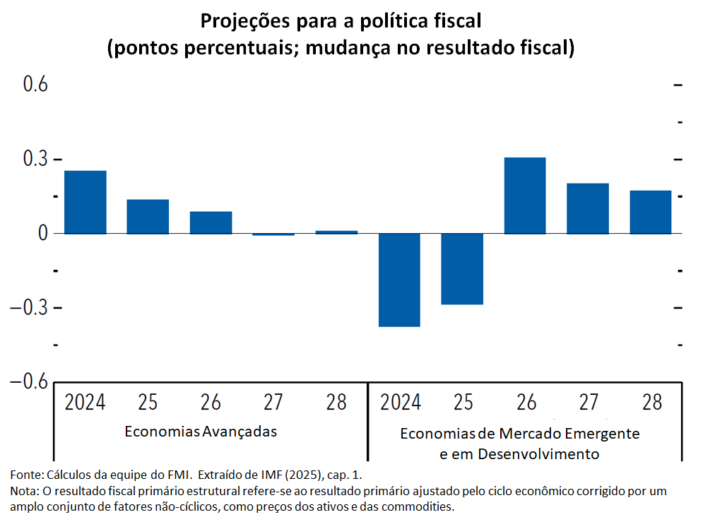 • Política fiscal: as economias avançadas devem manter uma postura fiscal neutra, ao contrário o que considerava o cenário de abr/25. Em contrapartida, nos emergentes, a política fiscal se tornará mais restritiva em 2026 em cerca de 0,2 p.p. do PIB em média, revertendo a orientação expansionista prevista para 2025. A dívida pública nesse grupo de economias deve atingir 82% do PIB em 2030, em comparação com pouco menos de 70% em 2024.
