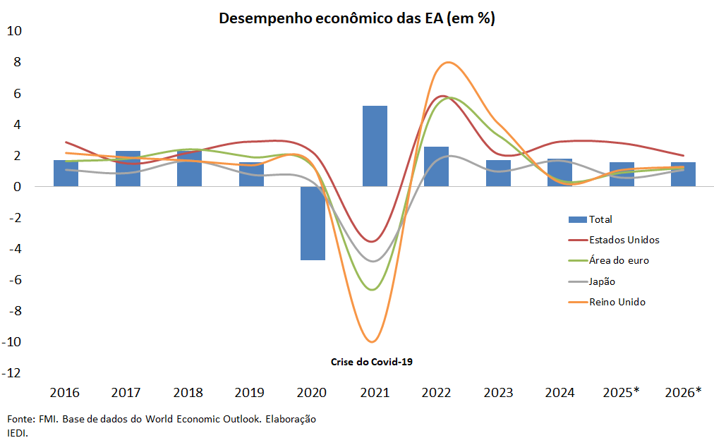 No cenário básico do FMI, a projeção é de uma desaceleração do crescimento nas EAs de 1,8% em 2024 para 1,6% em 2025 (+0,1 p.p. frente à projeção de abril de 2025) e manutenção do mesmo ritmo em 2026 (mesma projeção que em abril), o que reflete o resultado líquido de tendências divergentes nas principais EAs. Contudo, em todos os casos, a revisão na comparação com o cenário de outubro de 2024 foi negativa.