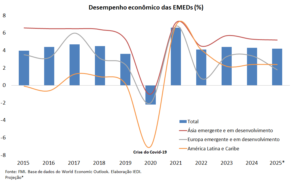 Para as EMEDs, o FMI prevê uma desaceleração do crescimento de 4,3% em 2024 para 4,2% em 2025 e 4,0% em 2026 (+0,5 p.p. e +0,1 p.p. na comparação com o cenário de abril). O maior dinamismo das EMEDs, por sua vez, decorre da aceleração das economias de baixa renda de 4,2% para 4,4% e 5,0% (+0,2 p.p, e -0,2 p.p. frente a abril), enquanto as economias de mercado emergente e renda média desacelerarão de 4,3% para 4,1% e 3,9% no mesmo período. Contudo, a revisão negativa frente a outubro de 2024 foi maior para o primeiro grupo de economias.