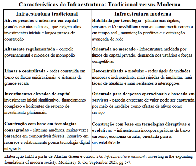 A infraestrutura tradicional, lembra o relatório, é caracterizada por ser intensiva em capital, altamente regulamentada, centralizada e construída com base em tecnologias consagradas. Em contraste, a infraestrutura moderna apresenta características distintas: é habilitada pela tecnologia, orientada pelo mercado, descentralizada e modular, baseada em serviços e construída com tecnologias disruptivas e sustentáveis, e incorporando ativos mais novos como redes de fibra óptica, data centers em hiperescala e estações de carregamento de veículos elétricos, entre outros.
