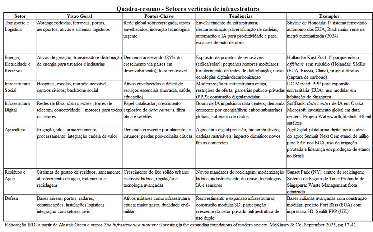 A definição ampliada de infraestrutura se manifesta, de acordo com o estudo, em sete grandes setores verticais de infraestrutura, muitos dos quais combinam ativos físicos, novas tecnologias e serviços contínuos. Estes sete setores críticos de infraestrutura são: transporte e logística; energia e eletricidade; digital; social; gestão de resíduos e água; agricultura; e defesa.