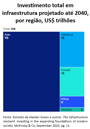 De acordo com a McKinsey, o investimento projetado varia consideravelmente por região, com a Ásia sozinha respondendo por mais de dois terços, com US$ 70 trilhões. Essa maioria substancial reflete a rápida urbanização, o crescimento populacional e a contínua expansão industrial da Ásia. Grande parte desse volume de investimento será destinada a transporte, energia e conectividade digital para atender à crescente demanda em megacidades e zonas industriais.