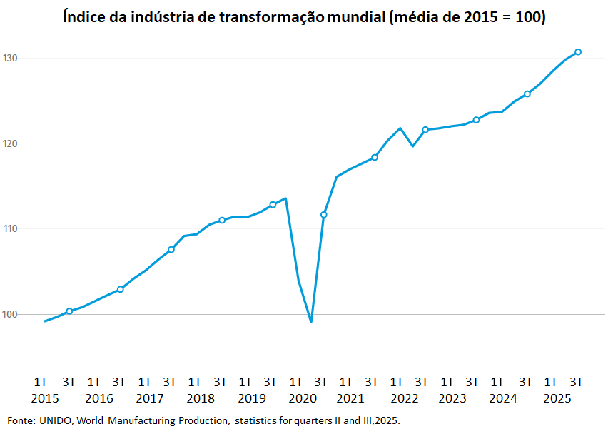 De acordo com a UNIDO, a economia global tem demonstrado notável resiliência, apesar de desafios significativos, como o aumento das tarifas, as pressões inflacionárias, os gargalos nas cadeias de suprimentos, a instabilidade política e os conflitos regionais, refletindo o padrão consistente de crescimento trimestral positivo do setor manufatureiro observado desde meados de 2022.