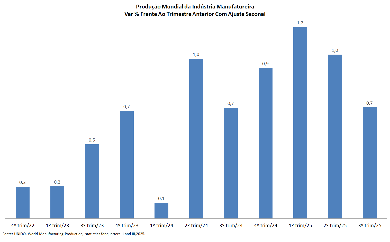 De acordo com o relatório mais recente divulgado pela UNIDO (United Nations Industrial Development Organization), os dados do 3° trim/25 da indústria de transformação global indicam nova alta da produção na comparação com trimestre imediatamente anterior na série com ajuste sazonal (+0,7%), após crescer +1,0% no trimestre anterior. Isso reforça um padrão de seis trimestres de expansão constante, com o crescimento trimestral oscilando perto de +1,0% ou acima dele.