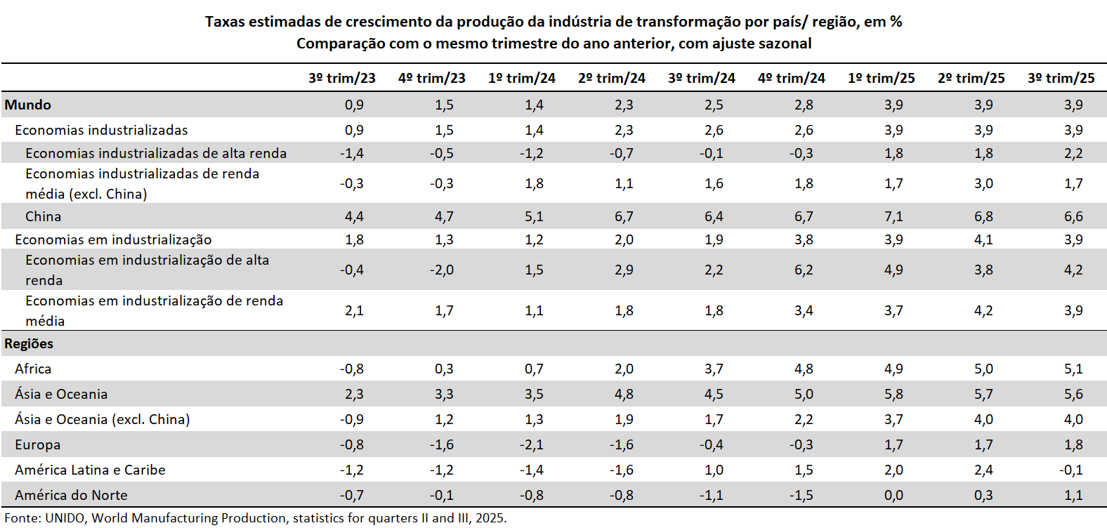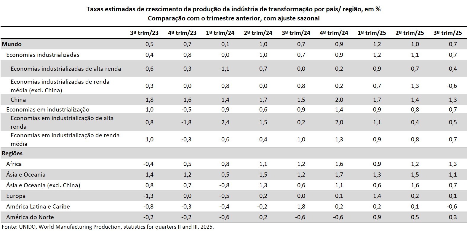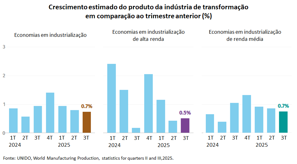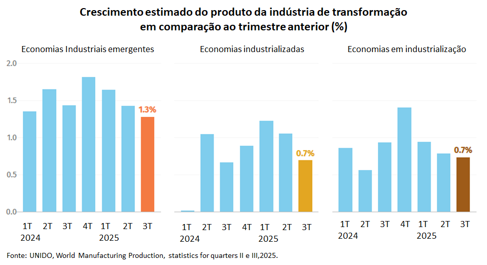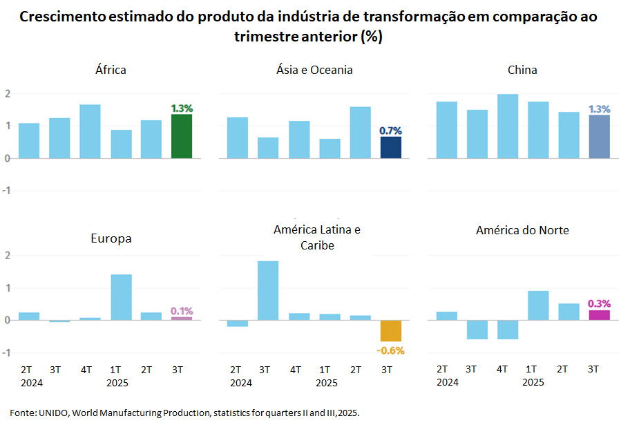 A atividade manufatureira global registrou crescimento trimestral (trimestre/trimestre anterior) em quase todas as regiões no 3º trim/25, porém com bastante variação entre elas. Cabe destacar que, em termos gerais, em todas as regiões, a indústria apresentou resultados inferiores ao trimestre anterior, mas com maior desaceleração na Ásia e na América Latina. A África foi exceção, mas seus dados são limitados, segundo a UNIDO.