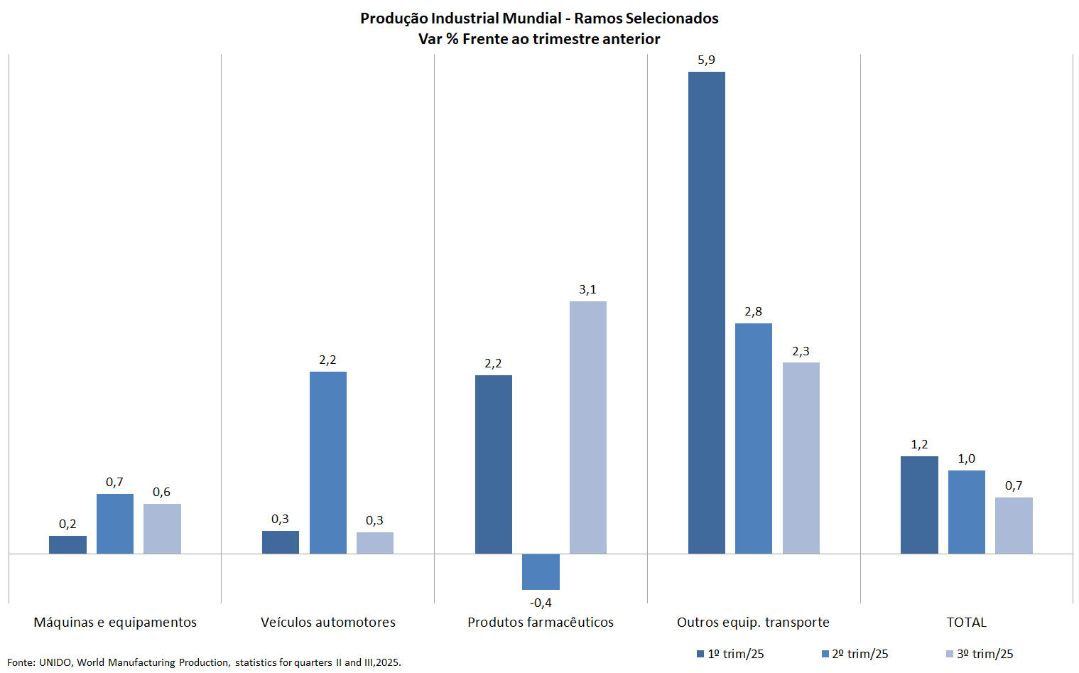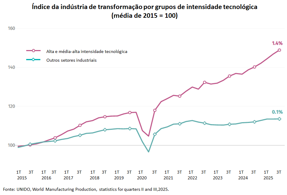 De acordo com a UNIDO, os dados do 3° trim/25 mostram que as indústrias de conteúdo tecnológico mais elevado continuam demonstrando forte dinamismo em meio a muitos desafios.