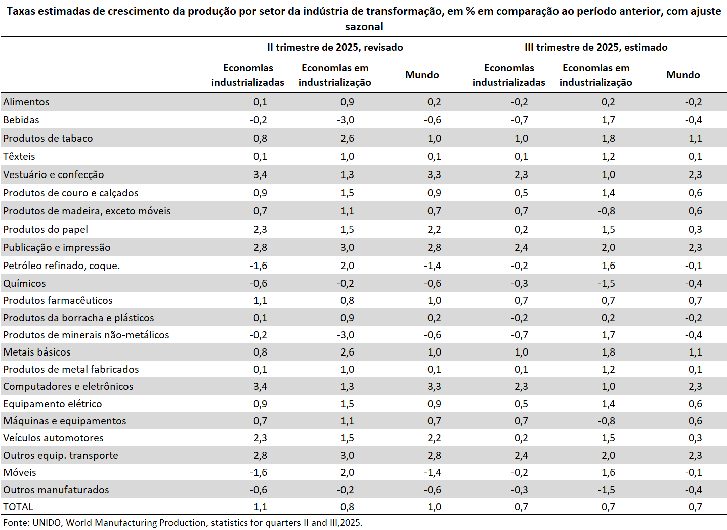 Cabe observar que as séries empregadas pela UNIDO possuem ajuste sazonal, embora usualmente o IBGE use dados sem ajuste nas comparações frente ao mesmo período do ano anterior. Por esta razão, pode haver pequena alteração em relação aos resultados divulgados pelo IBGE.
