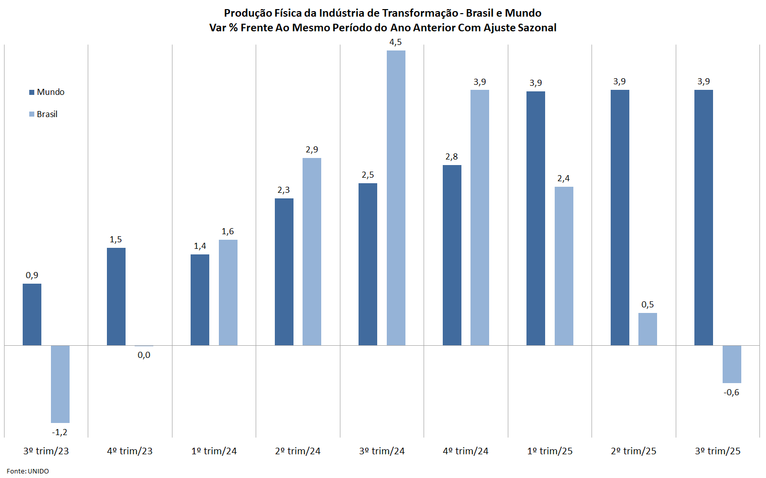 Em contraste com o mesmo período do ano passado, também com correção sazonal, como faz a UNIDO, o desempenho do setor no mundo foi de +3,9%, dando prova de notável resiliência, dado que este resultado vem se mantendo desde o início de 2025. O contraste com o Brasil é nítido, ao passar de +2,4% no 1º trim/25 para -0,6% no 3º trim/25.