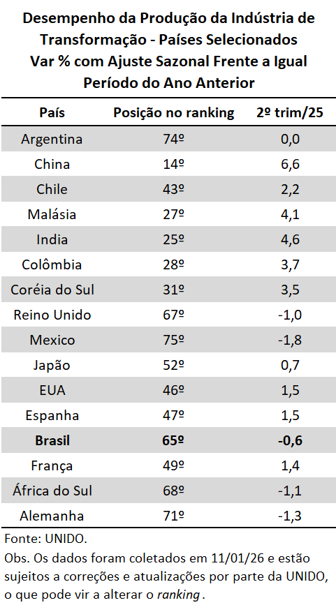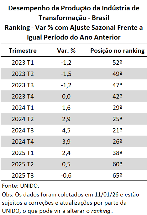 Dentre os 80 países da amostra com dados disponíveis na base da UNIDO, considerado apenas o desempenho do 3º trim/25 frente o 3º trim/24, o Brasil apresentou significativa piora: aparecemos na 65ª colocação, após termos ficado na 60ª posição no 2º trim/25 (+0,5%) e 39ª posição no 1º trim/25 (+2,4%).