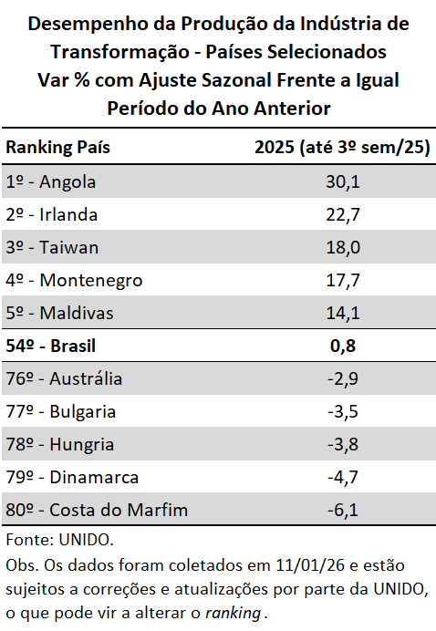 A partir da base de dados da UNIDO, o IEDI elaborou rankings internacionais de crescimento da produção da indústria de transformação com 80 países para o 3º trim/25.