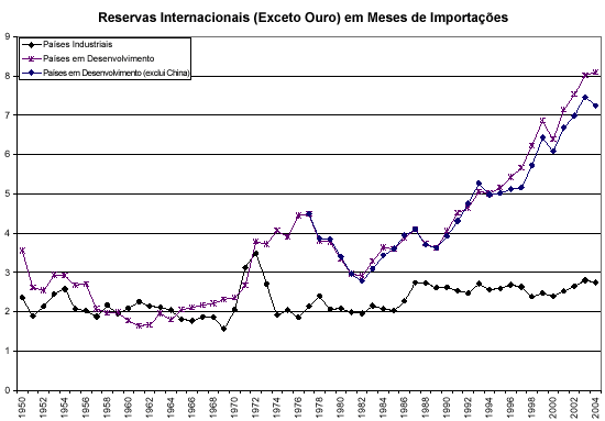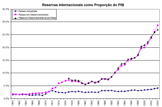 Enquanto nos países industrializados as reservas internacionais se mantêm desde 1950 abaixo de 5% do PIB e de três meses de importações, nos países em desenvolvimento houve massiva acumulação de reservas claramente relacionada às mudanças nas magnitudes financeiras associadas à globalização e não nas quantidades reais (como produto e importação). Atualmente o patamar médio das reservas mantidas por esses países está em oito meses de importações (dez meses de importações no caso dos países asiáticos). Como proporção do PIB, as reservas internacionais saltaram do intervalo de 6% a 8% durante as décadas de 1970 e 1980 para quase 30% em 2004.