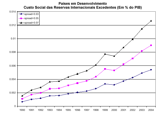 A partir dos cálculos realizados para três níveis de spread (3%, 5% e 7%), Rodrik mostra que o custo social estimado das reservas aumentou consideravelmente desde o início dos anos 1990, acompanhando a rápida ampliação dos níveis de reservas. Considerando o ponto intermediário do intervalo de spread, este custo monta, atualmente, a cerca de 1% do PIB anual dos países em desenvolvimento, considerados em seu conjunto. Ou seja, é um número muito elevado por qualquer parâmetro que se adote.
