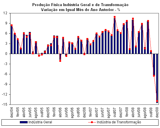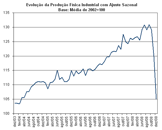 Refletindo os efeitos da recessão nas economias avançadas sobre os fluxos do comércio e sobre as expectativas dos empresários, a produção física da indústria brasileira recuou 12,4% na passagem de novembro a dezembro, descontados os efeitos sazonais. Esse foi o pior resultado dessa série histórica iniciada em 1991, surpreendendo os analistas do mercado financeiro e das consultorias econômicas. A retração foi generalizada, atingindo todas as quatro categorias de uso e 25 das 27 atividades pesquisadas da série com ajuste sazonal, com destaques para veículos automotores (–39,7%) e máquinas e equipamentos (–19,2%).