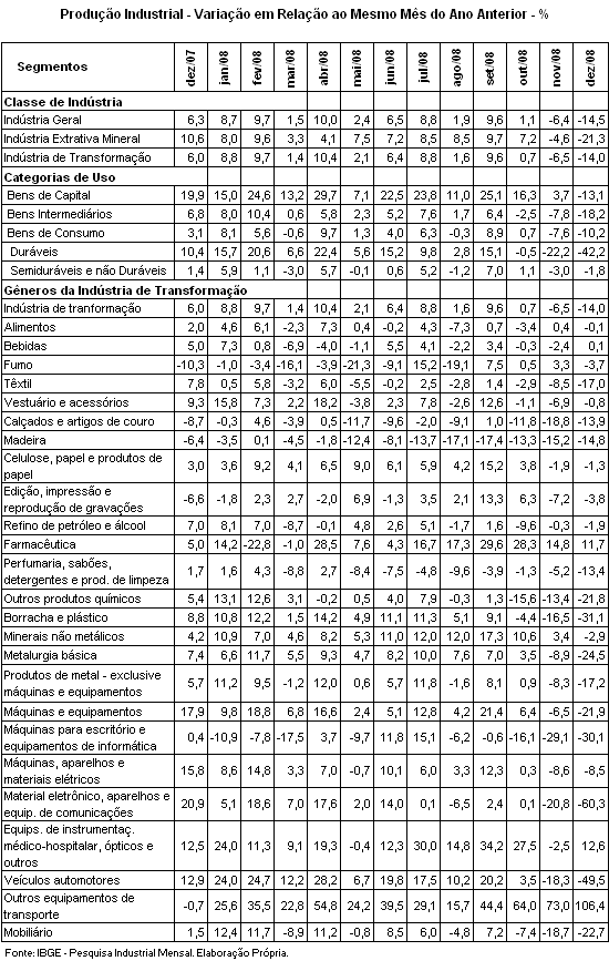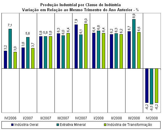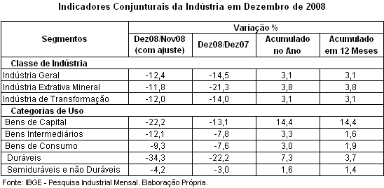 Em relação a dezembro de 2007, indústria de transformação contraiu 14%, enquanto a indústria extrativa mineral registrou decréscimo de 21,3%. Em 2008, a indústria extrativa acumulou incremento de 3,8%. Já a indústria de transformação acumulou aumento de produção de 3,1% na comparação com igual período do ano anterior.