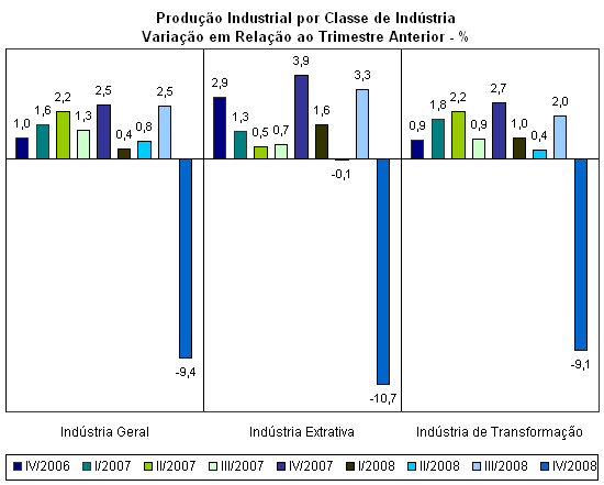 Nas séries trimestrais, a indústria também registrou queda. No último trimestre de 2008, a produção fabril recuou 9,4% na comparação com o período imediatamente anterior e 6,2% em relação ao quarto trimestre de 2007. Com esses resultados negativos no último trimestre, o crescimento acumulado pela indústria em 2008 ficou em 3,1%, bem abaixo do resultado acumulado até setembro (6,4%) e praticamente a metade da expansão registrada em 2007 (6,1%).