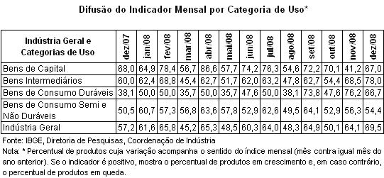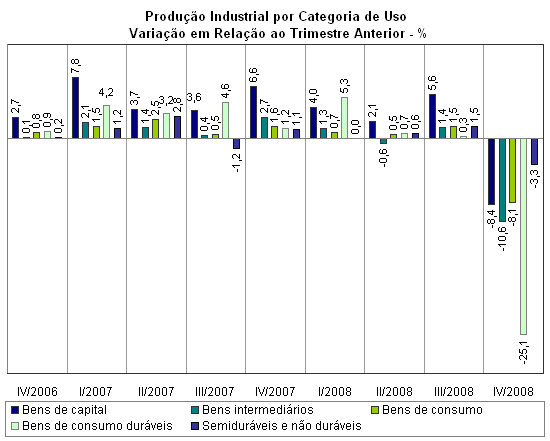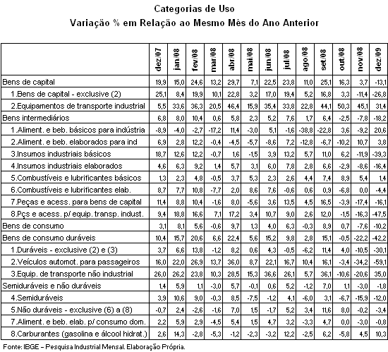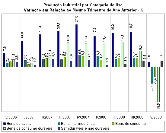 Todas as quatro categorias de uso registraram variação negativa também na comparação com dezembro de 2007. O setor produtor de duráveis, um dos líderes da expansão da atividade fabril até setembro de 2008, registrou queda recorde de –42,2%, a mais elevada entre as categorias, em razão da forte retração na fabricação de automóveis (–58,9%), celulares (–61,4%) e eletrodomésticos (–17,5%). O setor de bens intermediários registrou recuo de –18,2%, enquanto a produção de máquinas e equipamentos declinou –13,1%. Mais dependente da renda do que do crédito, o setor de bens de consumo semiduráveis e não-duráveis foi a categoria de uso que apresentou o menor recuo na série mensal: –3,4%.